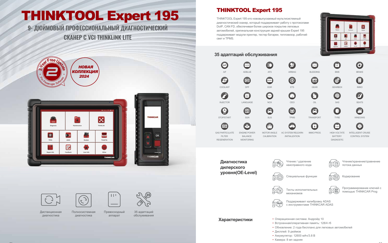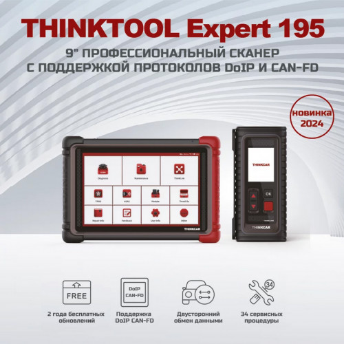 THINKCAR THINKTOOL Expert195 - это диагностический сканер для автосервисов, который обеспечивает полный спектр диагностических функций. Он оснащен 9" планшетом с поддержкой новейших протоколов DoIP и CAN FD, что позволяет диагностировать все системы автомобиля на дилерском уровне.