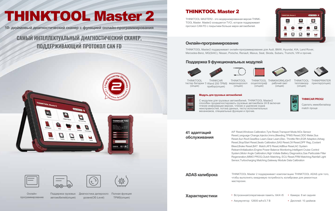 THINKTOOL MASTER 2 — современный и функциональный прибор для полноценной диагностики, включая нетипичные задачи, возникающие при ремонте и обслуживании автомобилей. Благодаря новому TVCI, сканер поддерживает возможности онлайн-программирования блоков авто. Также есть функции кодирования и адаптации блоков. Помимо задач основной диагностики (чтение, расшифровка, удаление ошибок), Синктул Мастер 2 также отображает информацию о системах, автоматически распознает модель и марку авто по VIN-номеру при подключении, проводит тесты исполнительных механизмов и выполняет более 40 сервисных функций.