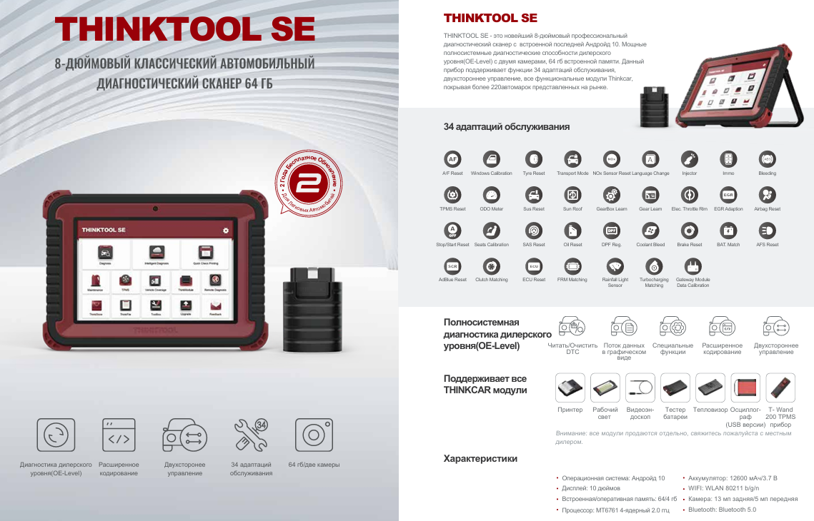 Оборудование ThinkTool SE позволяет производить полную диагностику всех электронных блоков управления легковых автомобилей и легкого коммерческого транспорта европейского, американского, азиатского и японского рынка. Поддерживает как бензиновые, так и дизельные автомобили с левым или правым рулем.