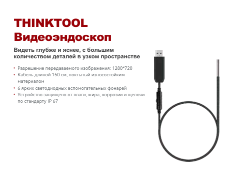 Видеоэндоскоп THINKCAR Video Scope (TKV S1) — это не самостоятельное устройство, а профессиональный интегрируемый модуль, предназначенный для работы в паре со сканерами линейки THINKTOOL. Он превращает ваш диагностический прибор в многофункциональную станцию, позволяя проводить визуальный осмотр труднодоступных полостей двигателя, кузова и узлов непосредственно на основном дисплее сканера, без необходимости в отдельном приборе или смартфоне.